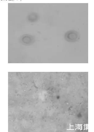 初次培養時,將肺組織勻漿后的上清液接種PPLO培養液后3 d,培養基顏色開始變為棕黃色,繼續傳代培養時,培養基顏色變色時間縮短,在1——2 d,便可由紅色變為棕黃,培養液顏色均一,透亮無混濁現象。固體培養基上,2——4 d便可見針尖大小的菌落生長,在4X10倍視野下觀察所有平皿均有典型的“煎蛋樣”菌落出現,核心較厚,向下長入培養基中,周邊為一薄層的透明區(圖1)。