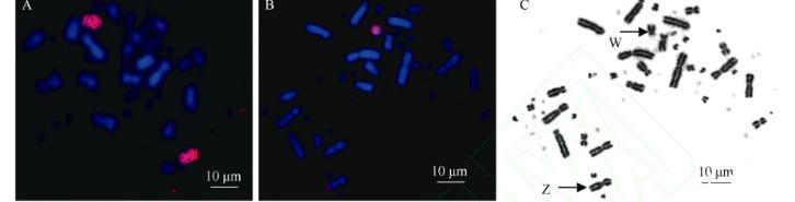 朱鹮性染色體鑒別在以前的研究中,通過流式分選,我們已獲得了石鸻(B.oedicnemus,鸻形目)的Z和W染色體特異探針(Nie et al,2009)。為準確鑒別朱鹮的性染色體,特別是W染色體,我們利用石鸻的Z和W染色體特異探針,分別與雄、雌性朱鹮的中期分裂相進行熒光原位雜交(圖6A,B)。在雄性朱鹮的中期分裂相中,石鸻的Z染色體探針涂染了一對中著絲粒染色體(圖6A),即Z染色體,與核型分析確定的Z染色體一致。在雌性朱鹮的中期分裂相中,石鸻的W染色體探針涂染了一條較小的亞端著絲粒染色體(圖6B),直接證明W染色體是一條較小的亞端著絲粒染色體(圖6C)。另外,石鸻的Z和W染色體探針分別在朱鹮的一對微小染色體和Z染色體長臂的末端有交叉雜交的信號。這種交叉雜交的信號,在以石鸻的Z和W染色體探針與家雞的中期分裂相進行熒光原位雜交的實驗中也曾被檢測到(Nie et al,2009),表明石鸻的Z和W染色體探針中包含有與被雜交的染色體同源的序列,這些同源的序列可能是重復序列。