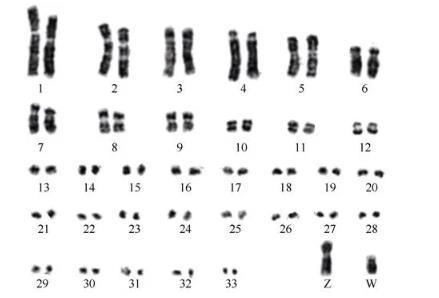 帶型分析目前,有關朱鹮顯帶染色體未見報道。在本研究中,我們首次進行了朱鹮染色體Ag帶、C帶(圖4C,D)和G帶(圖5)顯示。在所觀察的20個細胞中,銀染的核仁組織者區(nucleolar organizer region,NOR)分布在一對微小染色體上(圖4C,箭頭所示)。C帶(異染色質)主要分布在多數大染色體的著絲粒區域,微小染色體多為C帶陽性,表明其微小染色體含有豐富的異染色質。W染色體和Z染色體的長臂末端均為C帶陽性(圖4D,箭頭所示)。朱鹮的染色體C帶與已報道的家雞的染色體C帶相似(Pollock&Fechheimer,1981)。圖5為朱鹮的G帶核型圖,染色體排列方式參照Liu et al(1992)的報道,按染色體的相對長度,從長到短進行排列。G帶分析結果表明,除雌性性染色體為異配的ZW以及雄性性染色體為同配的ZZ外,雌、雄個體的G帶核型一致;Z染色體為中著絲粒染色體,相對長度僅次于第5號染色體;W染色體長度約為Z染色體的一半。這些結果與Liu et al(1992)的報道一致。雖然可以根據性染色體為同配或異配來鑒別鳥類的性別,但鳥類的W染色體較小,長度與一些較小的常染色體相當,因此,在常規染色的分裂相中,僅根據外形,很難準確鑒別W染色體(Shields,1982)。對于朱鹮W染色體的形態,Takasi&Sasaki(1974)的報道為亞端著絲粒染色體,Liu et al(1992)認為是中著絲粒染色體,而我們的G帶核型分析支持其為亞端著絲粒染色體(圖5)。