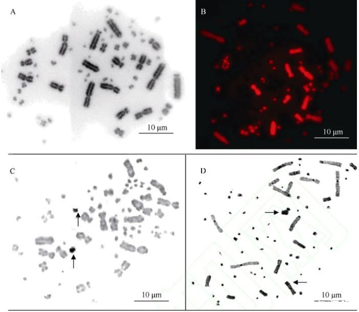 染色體數目和形態鳥類染色體所具有的大量微小染色體在使用Giemsa染液染色時著色較淺(圖4A),在染色體分散不理想時不易計數。為了準確計數微小染色體,我們采用能使所有鳥類染色體均勻著色的熒光染料碘化丙啶(propidium iodine,PI,Amresco)對所制備的中期染色體進行染色(圖4B)。對100個中期分裂相的計數結果表明,細胞的染色體眾數為2n=68,包括性染色體在內有10對大染色體,其余為微小染色體。我們的結果與Liu et al(1992)報道的朱鹮核型分析結果一致,證明我們所建立的細胞系確實來源于朱鹮。