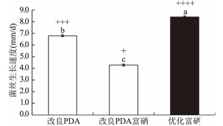 為了檢測響應(yīng)面結(jié)果的準(zhǔn)確性,以改良PDA培養(yǎng)基為陰性對照,以等量硒添加改良PDA培養(yǎng)基為陽性對照,配制上述最優(yōu)培養(yǎng)基配方進(jìn)行富硒粗毛纖孔菌菌絲培養(yǎng)實驗,每組八個重復(fù),測得粗毛纖孔菌及富硒粗毛纖孔菌菌絲生長速度見圖6。響應(yīng)面優(yōu)化培養(yǎng)基實測值8.41 mm/d>預(yù)測值8.19 mm/d>改良PDA實測值6.79 mm/d>等量硒添加改良PDA實測值 4.28 mm/d,且優(yōu)化后的富硒培養(yǎng)基培養(yǎng)的粗毛纖孔菌菌絲的稠密度更高(圖6)。與等量硒添加改良PDA相比,以響應(yīng)面優(yōu)化培養(yǎng)基進(jìn)行培養(yǎng),粗毛纖孔菌菌絲生長速度提高了0.965倍。此外,通過電感耦合等離子體質(zhì)譜法(ICP-MS)對最優(yōu)培養(yǎng)基培養(yǎng)菌絲的硒富集量進(jìn)行檢測,測得富硒粗毛纖孔菌菌絲硒富集量為31.584μg/g。說明采用響應(yīng)面法獲得的模型能較好地預(yù)測富硒粗毛纖孔菌菌絲的生長情況,該富硒培養(yǎng)基配方可以減少外源硒對粗毛纖孔菌菌絲抑制作用的影響,使其能夠在富硒的同時正常甚至更好地生長,提高富硒菌絲的產(chǎn)量,具有一定的實用價值。