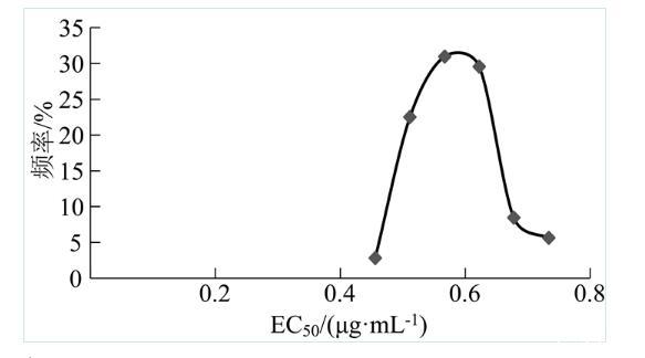 從河南省11個地區共分離獲得71株煙草黑脛病菌,藥劑敏感性結果(表1)表明,氟嗎啉對所有供試菌株的EC50值在0.428 5~0.760 8μg/mL,最大的EC50值與最小的EC50值之間相差1.78倍,平均EC50值為0.588 4μg/mL,表明來自河南省不同地區的煙草黑脛病菌對氟嗎啉的敏感性差異不大。其中,平均EC50值最低的菌株來自盧氏,為0.498 7μg/mL,平均EC50值最高的菌株來自汝陽,為0.666 1μg/mL,來自其他地區菌株的EC50值居于兩者之間。71株菌株對氟嗎啉的敏感性頻率分布呈連續單峰曲線(圖1),表明供試菌株對氟嗎啉敏感,未出現抗藥性亞群體。