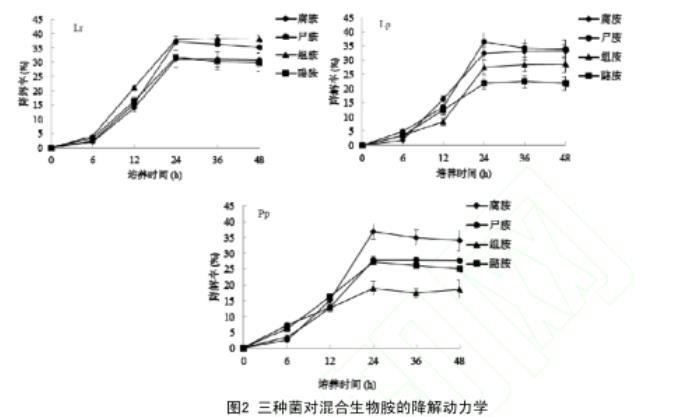 從圖2可以看出,分離到的三種菌均能夠同時降解腐胺、尸胺、組胺和酪胺,在24 h內,菌對肉湯培養基中生物胺的降解率逐漸升高,并在24 h達到最大降解量,此后基本持平或略有下降。其中,菌株Lr對組胺和尸胺有較強的降解能力,最高分別可達37.87%和37.11%;菌株Lp對腐胺和尸胺有較強的降解能力,最高分別可達32.39%和36.39%;菌株Pp也表現出較強的腐胺和尸胺降解能力,最高分達36.92%和27.89%。由此可知,Lr、Lp和Pp在發酵食品中具有一定的應用潛力。由圖1和圖2可得出結論:24 h為菌體最佳收獲時期同時也是菌體降解生物胺的最佳時期,如果發酵時間延長,菌體或多或少會產生一些有毒的代謝產物,這將影響魚肉的品質安全性,所以合適的菌株發酵時間非常重要。