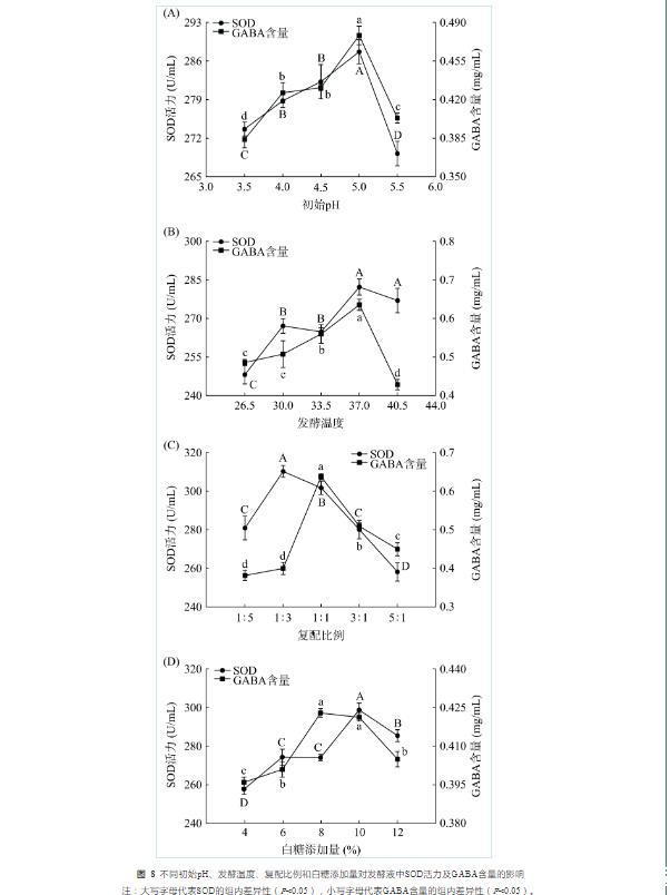 圖8不同初始pH、發(fā)酵溫度、復配比例和白糖添加量對發(fā)酵液中SOD活力及GABA含量的影響