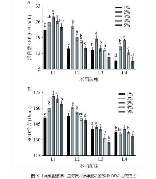 圖6不同乳酸菌接種量對復合發(fā)酵液活菌數(shù)和SOD活力的變化