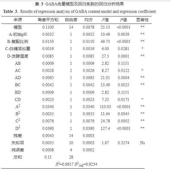 表3 GABA含量模型及回歸系數(shù)的回歸分析結(jié)果