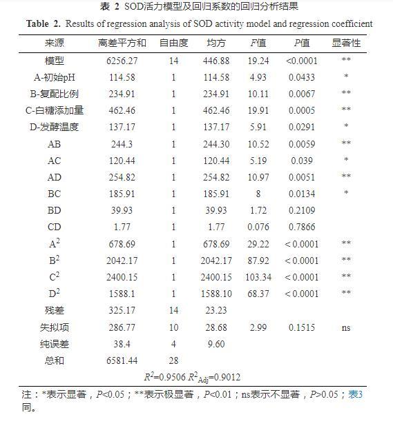 表2 SOD活力模型及回歸系數(shù)的回歸分析結(jié)果