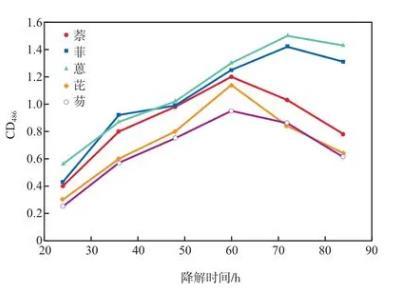 菌株N-3在不同PAHs體系中的脫氫酶活性見圖6。由圖6可見:菌株N-3在所有PAHs體系中的OD486都是先增大后減小;在菲和蒽體系中,菌株N-3的脫氫酶活性在前72 h上升迅速,而后略有下降;在萘、芘和芴體系中,菌株N-3的脫氫酶活性在前60 h上升迅速,而后呈下降趨勢,總體均低于菲和蒽體系中的脫氫酶活性。這表明該菌株對萘、芘和芴的降解能力沒有對菲和蒽的降解能力強(qiáng)。該結(jié)果與菌株N-3對不同PAHs降解率的結(jié)果呈正相關(guān)性,由此也可證明用脫氫酶活性表征微生物對有機(jī)污染物的降解能力是一種可靠的方法。
