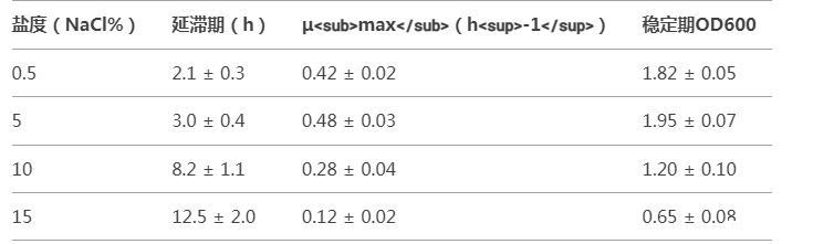 5% NaCl:延滯期略延長(3 h),但μ<sub>max</sub>最高(0.48 h<sup>-1</sup>),表明適度鹽度可能刺激生長。
