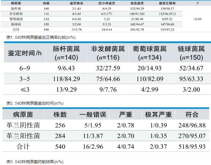 對比分析鑒定結(jié)果正確率及所需鑒定時間,分析藥敏結(jié)果符合率。