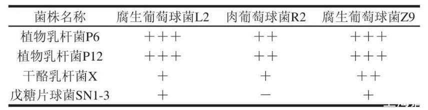 葡萄球菌與乳酸菌復配作為香腸發酵劑,可以在產香的同時保證低鹽發酵香腸的安全性,但是乳酸菌產生的細菌素以及乳酸會對葡萄球菌的生長造成不利影響,因此混合發酵劑的篩選必須考慮到菌株間的拮抗作用。本研究經過葡萄球菌與乳酸菌的拮抗實驗,發現戊糖片球菌SN1-3和肉葡萄球菌R2之間無明顯的拮抗作用,可以用于香腸混合發酵劑的開發。因此,后續實驗也將進一步利用SN1-3+R2復配組合制作低鹽發酵香腸,考察其混合發酵的效果,為我國自主產權低鹽發酵香腸混合發酵劑的研究和開發提供參考。