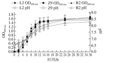 由圖9可知,葡萄球菌L2、Z9和R2均能在NB液體培養基中生長且長勢良好,這3株菌的生長速率和生長曲線的趨勢非常相似,生長調整期均較短,12 h后進入生長穩定期,菌數達到最大值。此外,這3株菌的pH值變化也非常相似,均隨培養時間的增加呈上升趨勢,在24 h后趨勢均逐漸平緩,與生長曲線趨勢大體一致。