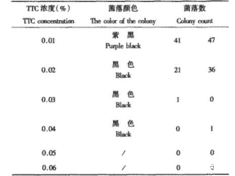 金黃色葡萄球菌在不同TTC濃度試驗組中,菌落顏色變化和大腸埃希菌組相同,只是在TTC終濃度≤0.004%時,菌落數(shù)量和對照組基本相當(dāng);TTC終濃度≥0.006%時,菌落數(shù)量明顯減少;TTC終濃度≥0.02%時,幾乎無菌落出現(xiàn)(表2)。