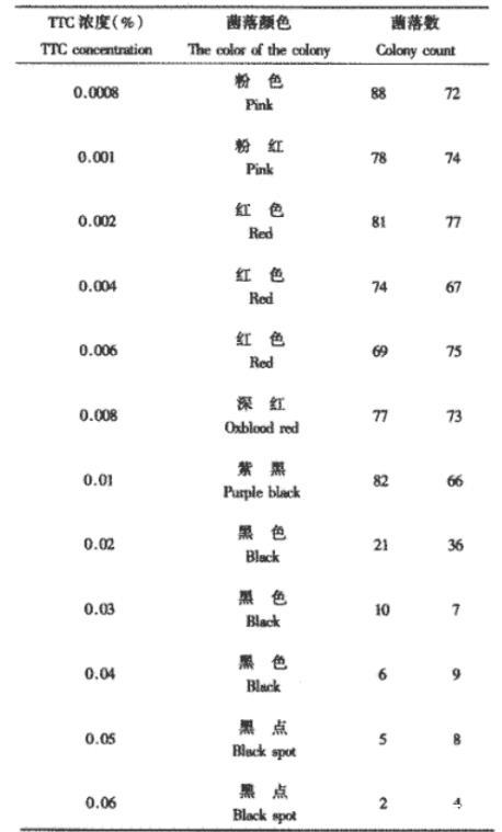 大腸埃希菌在不同TTC濃度試驗組中,TTC終濃度為0.002%時,菌落呈紅色,菌落大小與對照組相當(dāng);TTC終濃度≤0.01%時,菌落數(shù)量和對照組基本相當(dāng);TTC終濃度≥0.02%時,菌落呈黑色、點狀,菌落數(shù)量也明顯減少(表1)。