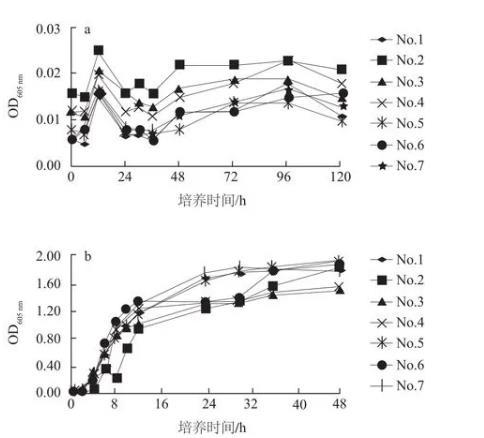 圖3 7株細菌在4℃(a)及35℃(b)的生長曲線