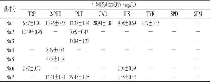 表2 7株細菌的生物胺產生情況