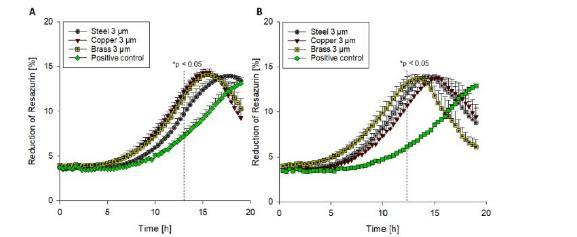 圖5、與結(jié)構(gòu)化(3μm)銅、黃銅和鋼以及未經(jīng)處理的孢子接觸后,孢子生長(zhǎng)和發(fā)芽過程中代謝活性的發(fā)育,沒有任何金屬表面接觸。代謝活性測(cè)量為A)A.niger野生型N402孢子和B)A.niger色素沉著突變菌株(MA 93.1)與3μm USP-DLIP功能化表面接觸120分鐘后刃天青(%)的相應(yīng)減少。將陽性對(duì)照的代謝速率與處理過的孢子進(jìn)行比較,觀察到以下顯著性:A)鋼3μm(p=0.010)、銅3μm(p=0.0007)和黃銅3μm(p=0.0006)。數(shù)據(jù)顯示為平均值±標(biāo)準(zhǔn)誤差(n=3)。值得注意的是,在野生型孢子(p=0.03)的12小時(shí)時(shí)觀察到鋼和銅表面之間的特異性顯著差異,盡管由于隨著時(shí)間的推移重疊的代謝趨勢(shì),這種差異很難可視化。B)鋼3μm(p=0.006),銅3μm(p=0.010)和黃銅3μm(p=0.004)。