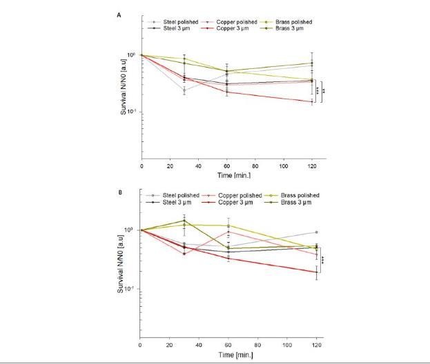 圖4、A)A.niger野生型N402孢子和B)A.niger色素沉著突變菌株(MA 93.1)在與相應(yīng)的功能化表面接觸30、60和120分鐘后的存活數(shù)據(jù)。存活分?jǐn)?shù)(N/N0)是相對(duì)于未暴露的孢子計(jì)算的(與金屬表面沒有任何接觸的初始孢子濃度)。