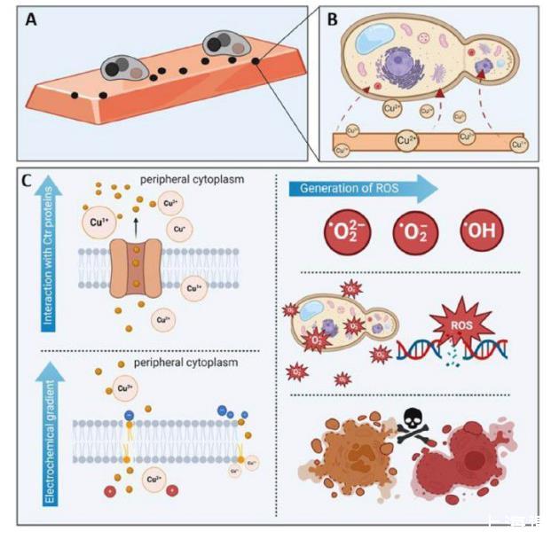圖1、銅表面對(duì)微生物物種抗菌作用的簡(jiǎn)化方案,這里是真菌細(xì)胞的示例。A,B)銅離子從銅表面溶解并進(jìn)入微生物(真菌細(xì)胞)壁和膜。通過與嵌入膜中的銅轉(zhuǎn)運(yùn)蛋白的直接相互作用或通過被動(dòng)機(jī)制(如跨膜的電化學(xué)梯度)進(jìn)行主動(dòng)運(yùn)輸,導(dǎo)致膜電位和細(xì)胞質(zhì)內(nèi)容物的損失。銅離子在細(xì)胞內(nèi)的積累必須達(dá)到一定的閾值才會(huì)變得有毒,這個(gè)閾值因生物體而異。C)不同的銅種類通過Fenton樣反應(yīng)誘導(dǎo)活性氧(ROS)的產(chǎn)生,基因組和質(zhì)粒DNA降解,最終導(dǎo)致細(xì)胞死亡。