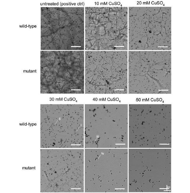 圖2、在30°C(終點(diǎn))下孵育30小時(shí)后,所有測(cè)試的CuSO4濃度(10×10、20×10、30×10、40×10、50×10m)以及兩種菌株的未處理對(duì)照。比例尺對(duì)應(yīng)于50μm
