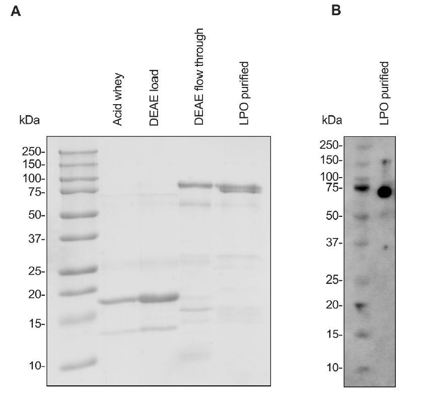 圖2、乳過氧化物酶(LPO)的分離。(A)在LPO分離過程中,對選定的餾分進行十二烷基硫酸鈉-聚丙烯酰胺凝膠電泳,從酸性乳清通過二乙氨基乙基(DEAE)瓊脂糖凝膠陰離子交換柱,最終得到LPO分離物。(B)分離的LPO的Western blot分析。