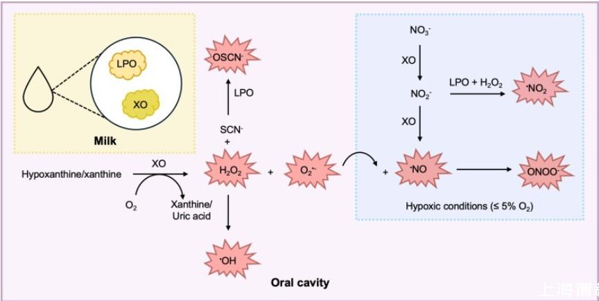 圖1、牛奶和口腔之間擬議的黃嘌呤氧化酶(XO)-乳過氧化物酶(LPO)系統(tǒng)概述。在母乳喂養(yǎng)期間,乳源性XO和LPO會在口腔中遇到它們的底物次黃嘌呤/黃嘌呤和硫氰酸鹽(SCN-)。XO-LPO系統(tǒng)可以產(chǎn)生一系列抗菌活性氧和氮物質(zhì)(標記為紅色),例如過氧化氫(H2O2)、超氧化物(O2-)、次硫氰酸鹽(OSCN-)、二氧化氮(NO2)、氮氧化物(NO)和過氧亞硝酸鹽(ONOO–)。