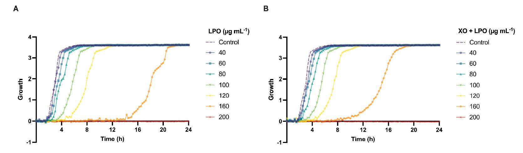 圖3、添加乳過氧化物酶(LPO)(A)或黃嘌呤氧化酶(XO)與LPO(B)聯(lián)合的細菌生長曲線。顯示了牛奶酶(0-200μg mL-1)對嬰兒口腔過夜培養(yǎng)的細菌生長的劑量依賴性抗菌作用。使用oCelloScope在37°C下每15分鐘監(jiān)測一次細菌生長24小時。數(shù)據(jù)表示為基于一式三份的平均值。