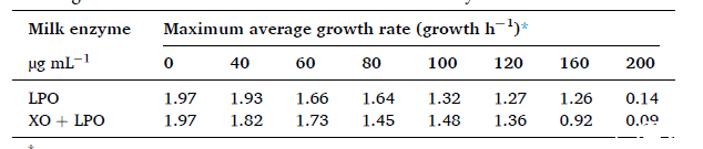圖5、乳過氧化物酶(LPO)和LPO聯(lián)合黃嘌呤氧化酶(XO)對嬰兒口腔培養(yǎng)細菌生長的影響。使用oCelloScope微生物動態(tài)監(jiān)測系統(tǒng)評估不同濃度的LPO和LPO聯(lián)合XO對嬰兒口腔培養(yǎng)的細菌的影響。生長曲線數(shù)據(jù)被轉(zhuǎn)換為最大平均增長率。單獨添加LPO或與XO聯(lián)合使用,均顯示出劑量依賴性抗菌作用。其中在較低濃度(40–80μg mL-1)下,酶導致滯后期略有延長,生長速率略有降低。在中等濃度(100–160μg mL-1)下,滯后期顯著延長,生長速率顯著降低。在最高測試濃度(200μg mL-1)下,細菌生長受到完全抑制。