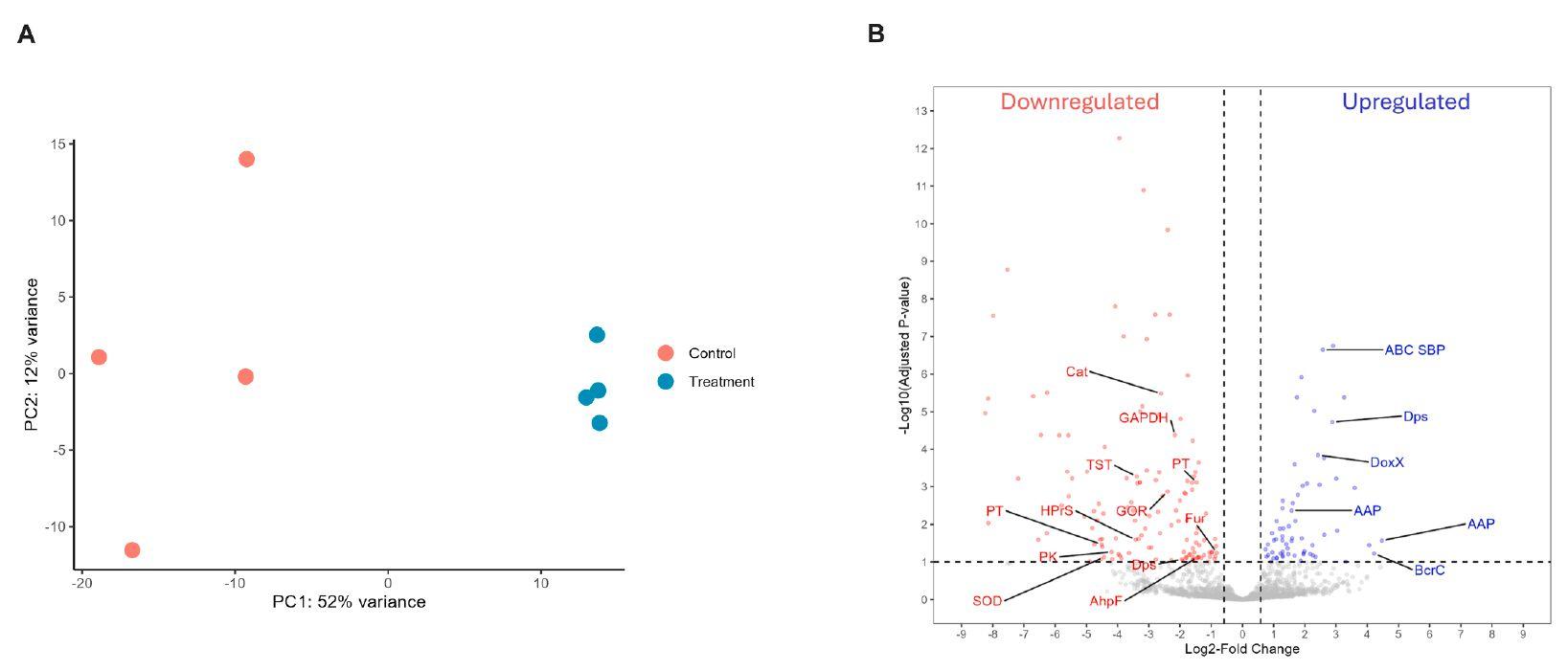 圖4、從嬰兒口腔培養(yǎng)的細菌中的基因表達分析。(A)基于轉(zhuǎn)錄組學數(shù)據(jù)的基因表達主成分分析。(B)火山圖顯示對照和處理之間差異表達的基因(黃嘌呤氧化酶-乳過氧化物酶,80μg mL-1)。紅點代表顯著下調(diào)的基因,藍點代表顯著上調(diào)的基因。水平虛線表示調(diào)整后的p值=0.1的截止值。調(diào)整后的p值是使用Benjamini-Hochberg過程計算的,并針對多個檢驗調(diào)整p值。垂直線表示基因表達的log2Fold變化的臨界值±0.585,等于表達的1.5倍變化。