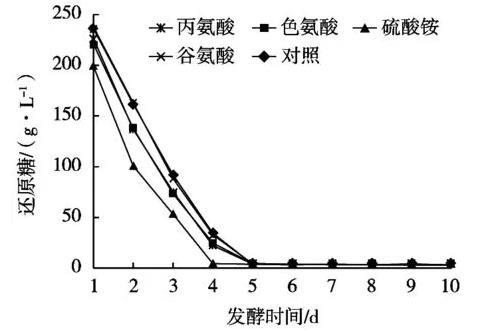 酵母菌生長過程需要氮源,當發酵液氮源含量較低時添加氮源有利于酵母菌繁殖。發酵初期較高的糖濃度不利于酵母生長,酵母需要一個適應時期。結果表明發酵的第1天酵母菌數量各處理處于較低水平,差異不顯著。發酵前3 d,各處理的酵母菌數量迅速增加,其中以添加硫酸銨處理酵母菌數量最高,達到2.83×108個/mL,添加丙氨酸、色氨酸處理酵母菌數量低于硫酸銨處理,達到2.38×108個/mL,添加谷氨酸和對照處理酵母菌最低,分別為2.18×108個/mL和2.12×108個/mL。第2天酵母菌數量各處理增加最多,說明酵母菌此時處于對數生長期,這與胡永正研究結果一致。第3天后添加硫酸銨處理酵母菌數量不變,其他處理緩慢提高,但增加速度慢,說明添加硫酸銨處理酵母菌生長進入穩定期,其他各處理酵母菌數量繼續提高,但增速顯著低于前3 d。隨后各處理酵母菌數量基本保持不變。酵母發酵過程中添加可同化氮可以提高酵母生長速率,但酵母菌對不同氮源利用有選擇性,試驗結果表明其優先利用硫酸銨態氮源,其次為丙氨酸、色氨酸類氮源,對谷氨酸利用較低(圖1)。