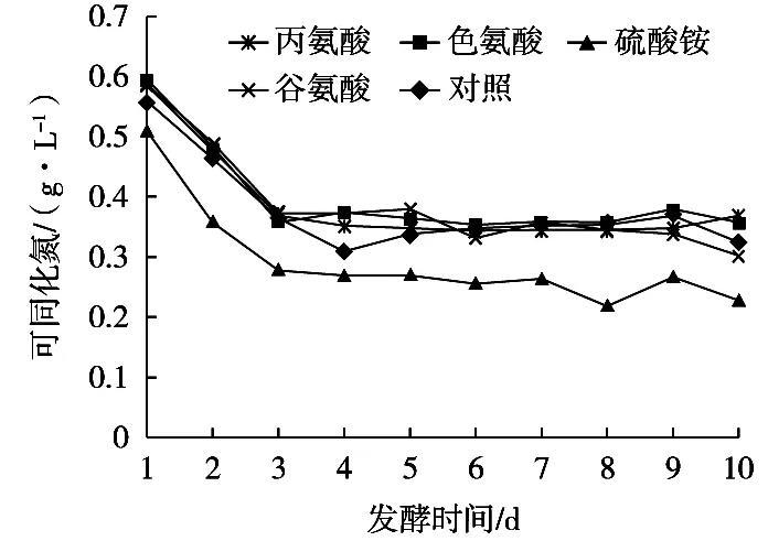 酵母生長過程中可以利用游離氨基酸和銨離子等可同化氮源,對不同的氮源利用有選擇性。發酵前3 d,可同化氮含量大幅度下降至最低點;隨后可同化氮含量趨于穩定。添加硫酸銨處理,可同化氮含量顯著降低,其他處理和對照差異不顯著。酵母數量進入穩定期后,可同化氮含量開始保持穩定(圖3)。發酵液添加氨基酸后,氨基酸被酵母吸收,然后合成作為細胞骨架的各種蛋白質和酶類。不同氨基酸吸收、合成不同,葡萄酒釀造過程中研究發現丙氨酸、色氨酸先被迅速消耗,后面又生成,谷氨酸迅速消耗后,后面不再生成。不同葡萄汁氨基酸含量差異大,酵母種類不同,發酵條件不同都會影響到酵母對氮源的吸收和生成。桑葚和葡萄汁中氨基酸含量與組成不同。因此,試驗結果中添加谷氨酸處理雖然酵母菌數量和還原糖含量與添加丙氨酸、色氨酸差異顯著,但可同化氮含量和添加丙氨酸、色氨酸差異不顯著。