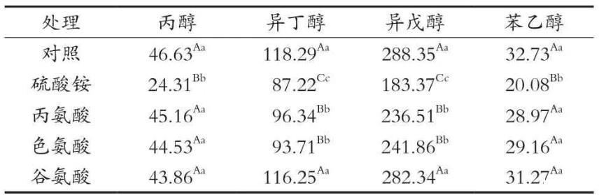 果酒釀造過程中通過支鏈氨基酸分解以及糖代謝合成途徑都可以產生各種高級醇。高級醇本身構成果酒的風味,與乙酸等酸反應生成酯類也影響果酒風味,含量低果酒風味寡淡,含量過高辛辣刺激感重,容易致醉(俗稱上頭)。高級醇中含量最高的是異丁醇和異戊醇,果酒內高級醇含量最好不要超過400 mg/L。通過敲除支鏈氨基酸轉氨酶基因,可有效降低釀酒酵母中高級醇的生成量。試驗結果表明不同可同化氮添加處理影響高級醇的生成,高級醇類型中異丁醇和異戊醇含量高,丙醇和苯乙醇含量較低。添加硫酸銨處理顯著降低丙醇、異丁醇、異戊醇和苯乙醇含量,添加谷基酸處理高級醇含量與對照無差異,不同氨基酸添加間丙醇、苯乙醇含量差異不顯著。添加丙氨酸和色氨酸處理與谷氨酸處理和對照處理異丁醇和異戊醇含量差異顯著(表1)。孫時光等研究發現添加丙氨酸、精氨酸和磷酸氫二銨后可以顯著降低桑葚酒高級醇含量,谷氨酸效果不明顯,試驗結果與之相似。李智慧等研究可同化氮素對黃酒酵母產高級醇的影響,結果發現氯化銨等無機氮素降低高級醇的效果最好,添加苯丙氨酸產生更多高級醇,添加谷氨酸可以降低高級醇含量,原因與黃酒中氨基酸組成和發酵采用酵母差異有關。商玉薈等在荔枝酒中添加不同氨基酸的研究結果表明,在中高質量濃度的精氨酸與谷氨酰胺處理之后,正丙醇的含量有著較明顯增加,而丙氨酸處理則沒有明顯變化,不同氨基酸對高級醇影響不同。