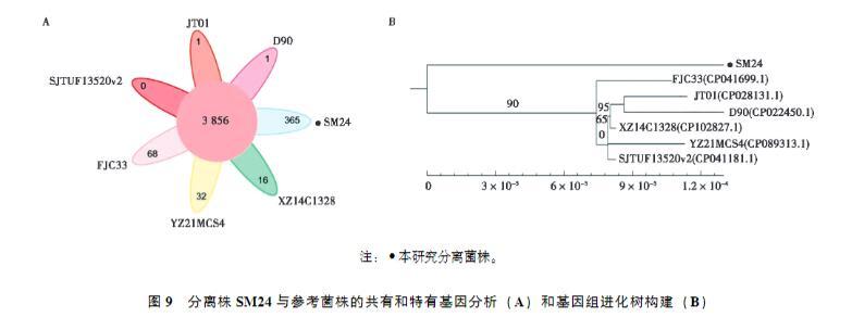 圖9分離株SM24與參考菌株的共有和特有基因分析(A)和基因組進化樹構建(B)