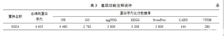 全基因組測序數據通過SeqSero 1.2數據庫比對,顯示分離株SM24的O抗原為O4,H1抗原為z,H2抗原為1,7,血清型確定為印第安納沙門菌。對基因組序列進行數據庫比對注釋結果見表3,其中NR注釋的序列為4 460條、GO注釋的序列為2 762條、eggNOG注釋3 809條、KEGG注釋3 208條、Swiss注釋3 809條、CARD注釋144條、VFDB注釋280條。