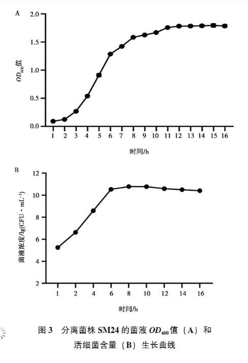 圖3分離菌株SM24的菌液OD600值(A)和活細菌含量(B)生長曲線