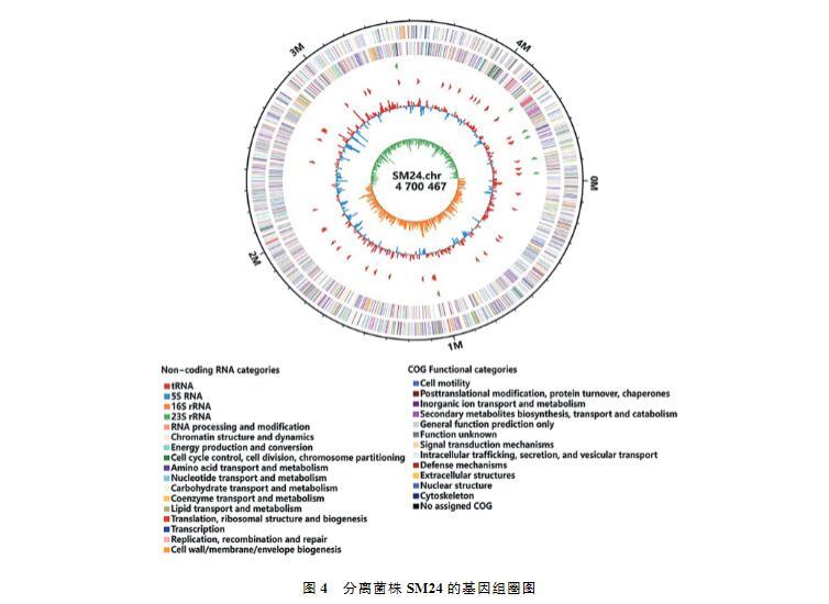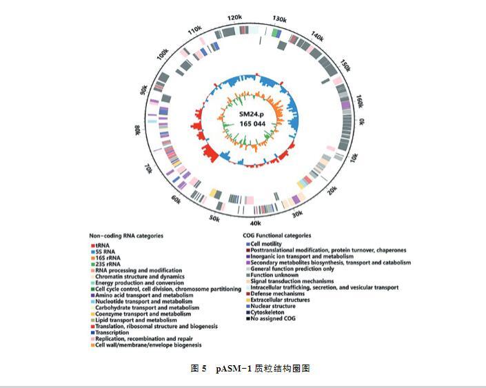對分離株SM24進行全基因組測序(見圖4、5),獲得其全基因組大小為4 865 511 bp,GC含量為51.96%。基因組包含1個完整的細菌染色體序列和1個完整的質粒序列,其中染色體序列大小為4 700 467 bp,質粒大小為165 044 bp,質粒命名為pASM-1。質粒類型分析顯示,pASM-1為IncHI2質粒,包含IncHI2和IncHI2A兩個復制子。基因組序列共有4 635個編碼蛋白的基因,含有108個非編碼RNA序列,包括86個tRNA、8個5S rRNA、7個16S rRNA和7個23S rRNA,并且存在2個CRISPR元件(CRISPR1和CRISPR2)和10個前噬菌體序列。