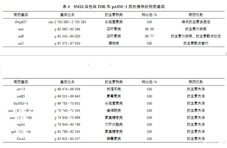 表4 SM24染色體IME和pASM-1質粒攜帶的耐藥基因