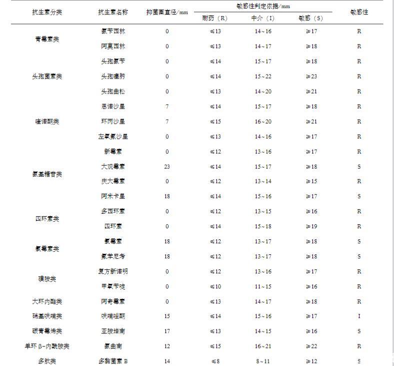 分離株SM24的藥物敏感性測定結果如表2所示,SM24對大觀霉素、阿米卡星、氯霉素、氟苯尼考、亞胺培南和多黏菌素B這6種抗生素敏感;對呋喃唑酮中介;對青霉素類(氨芐西林、阿莫西林)、頭孢菌素類(頭孢氨芐、頭孢噻肟、頭孢曲松)、喹諾酮類(恩諾沙星、環丙沙星、左氧氟沙星)、四環素類(多西環素、四環素)、磺胺類(復方新諾明、甲氧芐啶)以及新霉素、慶大霉素、阿奇霉素和氨曲南這16種抗生素表現耐藥。以上結果說明分離株SM24屬于多重耐藥性菌株,抗生素耐藥譜極廣。