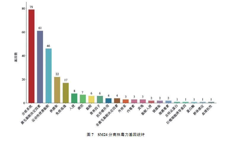 通過VFDB數據庫比對分析,發現菌株SM24共注釋到280個毒力基因,編碼的產物主要參與分泌系統、菌毛黏附、鐵攝取、免疫逃避等(圖7)。其中與細菌分泌系統相關的注釋基因共79條,占28.21%,主要包括毒力島1(SPI1)和毒力島2(SPI2)基因編碼的Ⅲ型分泌系統(T3SS)以及由Hcp分泌島1(HSI-I)和沙門菌中心島(SCI)基因編碼的Ⅵ型分泌系統(T6SS);與細菌黏附有關的菌毛黏附決定因素和運動性侵襲黏附相關毒力基因分別注釋61條和46條,共占38.21%;鐵攝取相關毒力基因注釋了22條,其中包含典型的沙門菌素合成與轉運基因(iroBCDEN)、腸桿菌素的合成(entABC?DEF)和轉運(fepBCDG)相關毒力基因;編碼脂多糖(lpxAC、gtrAB等)和莢膜等與免疫逃避的毒力基因有17條。除此之外,還有與細菌入侵(invAC、orgAB等)、黏附(fimACDFH)、營養因子(allAB?CDRS)等多種毒力相關基因。