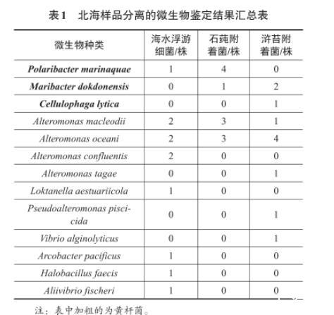 北海樣品分離的微生物鑒定結(jié)果見表1。北海樣品中共分離到13種菌,其中海水樣品中有8種,絲狀滸苔附著菌分離到7種,片狀滸苔附著菌分離到4種(3個樣品中分離到的菌株存在部分重復(fù),如交替單胞菌Alteromonas macleodii和Alteromonas oceani在3個樣品中都分離到;Polaribacter marinaquae和Maribacter dokdonensis分別在2個樣品中都有分離到)。共分離到3種黃桿菌:Polaribacter marinaquae、Maribacter dokdonensis、Cellulophaga lytica。其中,在海水及片狀滸苔上有分離到Polaribacter marinaquae(片狀滸苔上4次都分離到),絲狀滸苔上沒有分離到Polaribacter marinaquae;在片狀滸苔上和絲狀滸苔上都有分離到Maribacter dokdonensis(絲狀滸苔上2次分離到),海水中沒有分離到Maribacter dokdonensis;只在絲狀滸苔上分離到1株Cellulophaga lytica。