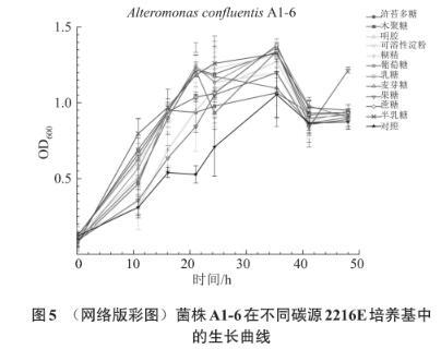 菌株Alteromonas Confluentis A1-6在不同碳源2216E培養(yǎng)基中的生長(zhǎng)曲線如圖5所示。與對(duì)照組相比,交替單胞菌Alteromonas confluentis A1-6除了在明膠和果糖中無(wú)明顯生長(zhǎng)外,其他碳源中都有生長(zhǎng),說(shuō)明交替單胞菌A1-6對(duì)碳源的利用較黃桿菌S7更具有廣譜性。其中對(duì)滸苔多糖、半乳糖和糊精的利用最明顯,以這些碳源作底物,菌體的生長(zhǎng)情況較其他糖類物質(zhì)作底物時(shí)更好。菌株A1-6不能利用明膠和果糖,可以利用葡萄糖、滸苔多糖、半乳糖、乳糖、木聚糖、蔗糖、可溶性淀粉、麥芽糖和糊精。
