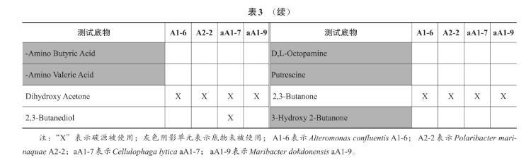 用BIOLOG對(duì)Alteromonas confluentis A1-6及3株黃桿菌Polaribacter marinaquae A2-2、Cellulophaga lytica aA-7和Maribacter dokdonensis aA-9的碳源利用譜進(jìn)行了檢測(cè),結(jié)果見(jiàn)表3。從表3可見(jiàn),在PM2A板的碳源底物中,4株菌都能利用果膠(Pectin);除Polaribacter marinaquae A2-2外,其他3株菌都能利用糊精(Dextrin);只有Cellulophaga lytica aA-7可以利用硫酸軟骨素C(Chondroitin Sulfate C)。4株菌都不能利用甘露聚糖(Mannan)、明膠(Gelatin)、菊粉(Inulin)、環(huán)糊精(α-/β-/γ-Cyclodextrin)、糖原(Glycogen)。