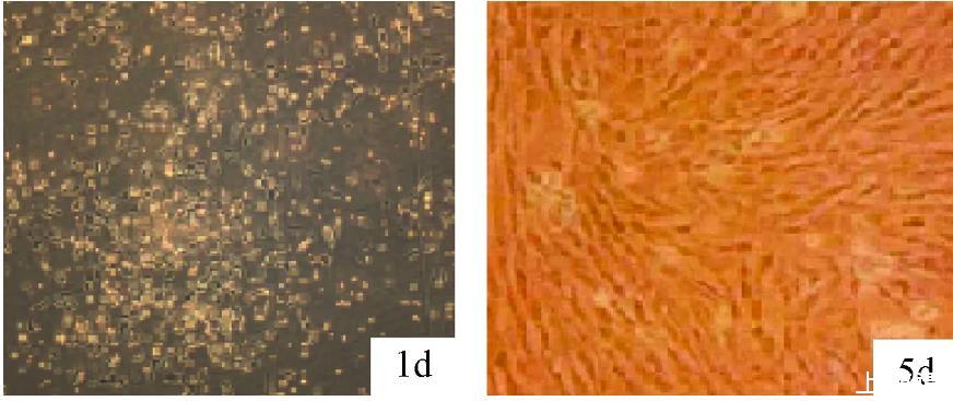 倒置相差顯微鏡下可見MSCs為圓形,大小不一,培養(yǎng)24 h后,開始貼壁,呈圓形,梭形,或多角形;5 d后,可見放射狀排列的細(xì)胞群,多為梭形,胞漿豐富,胞核大,核仁清晰。見圖1。