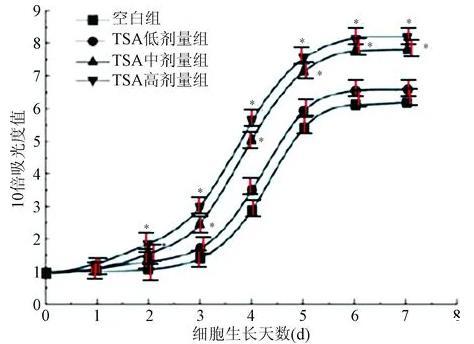 MSCs生長曲線的測定:將生長狀態(tài)良好的第2代MSCs以密度為5×103個接種于96孔培養(yǎng)板中,置于37℃、CO2飽和濕度的5%CO2培養(yǎng)箱中培養(yǎng),按上述TSA劑量分別加入各組中每天取1板進(jìn)行MTT檢測,連續(xù)1周。MTT檢測時應(yīng)用酶聯(lián)免疫檢測儀檢測各孔吸光度值,選擇波長為492 nm。按照檢測結(jié)果,以光吸收值為縱坐標(biāo),以細(xì)胞生長天數(shù)為橫坐標(biāo),繪制細(xì)胞生長曲線。