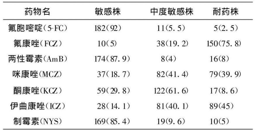 對198株白色念珠菌進行藥物敏感試驗,藥物敏感性由高到低為:氟胞嘧啶(92%)、兩性霉素(87.9%)、制霉素(85.4%)、酮康唑(29.8%)、咪康唑(18.7%)、伊曲康唑(14.1%)、氟康唑(5%);耐藥性由低到高為:氟胞嘧啶(2.5%)、制霉素(5%)、兩性霉素(8%)、酮康唑(8.6%)、咪康唑(39.9%)、伊曲康唑(45%)、氟康唑(75.8%),見表2。