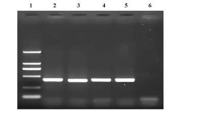 339份臨床標本包括痰、尿、咽拭子、血液等,PCR檢出結(jié)果顯示從痰標本中分離出的白色念珠菌最多77株占70.2%,其次是陰道拭子53株占67.4%,具體分布情況見表1,部分標本的PCR電泳圖見圖1,擴增出目的片段大小386 bp,與預期片段大小一致,其中5號泳帶為陽性對照,6號泳帶為陰性對照,其他3份標本均為白色念珠菌。
