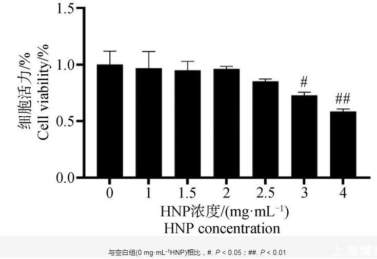 CCK-8結果如圖6所示,在1.5~2.5 mg·mL-1呼寧散作用下,細胞存活率為80%~95%,且無明顯差異性,呼寧散在3 mg·mL-1濃度下細胞活力顯著降低(P<0.05),在4 mg·mL-1呼寧散作用下細胞成活率極顯著降低(P<0.01),說明呼寧散在1~2.5 mg·mL-1濃度對細胞無明顯毒性作用,因此本試驗選用1.5、2、2.5 mg·mL-1作為呼寧散低、中、高劑量組的給藥濃度。
