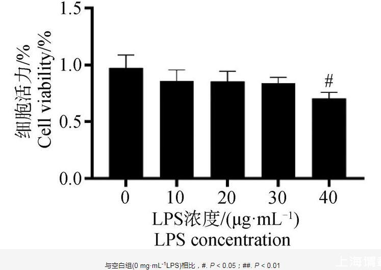 CCK-8結果如圖5所示,當LPS濃度在40μg·mL-1時,細胞存活率顯著下降(P<0.05)。因此,本試驗選擇40μg·mL-1作為LPS誘導DF-1細胞損傷模型的染毒劑量。