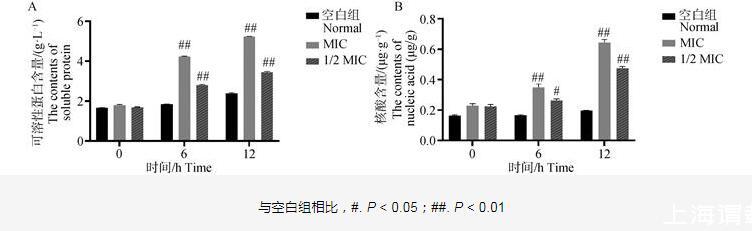 如圖4所示,空白組菌液中的可溶性蛋白含量和核酸含量基本穩定在較低水平,無明顯波動。與空白組相比,呼寧散作用6和12 h時,1/2 MIC組和MIC組培養液中的可溶性蛋白含量和核酸含量極顯著增加(P<0.01)。表明呼寧散能夠對雞肺源大腸桿菌的細胞膜造成破壞,導致胞外蛋白濃度升高、核酸外溢。