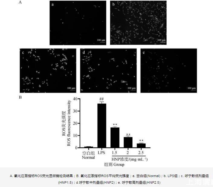 A.氧化應激指標ROS熒光顯微鏡檢測結果;B.氧化應激指標ROS平均熒光強度;a.空白組(Normal);b.LPS組;c.呼寧散低劑量組(HNP1.5);d.呼寧散中劑量組(HNP2);e.呼寧散高劑量組(HNP2.5)